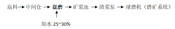 該流程適用于有再磨工藝系統(tǒng)的球團(tuán)廠,作為預(yù)磨設(shè)備先將返料磨粉后便于管道輸送至磨礦系統(tǒng)。該流程產(chǎn)品細(xì)度有保障,可充分利用自有磨礦系統(tǒng),生產(chǎn)環(huán)境好。